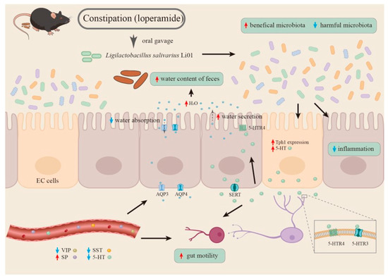 A summary of possible mechanisms by which Li01 can relieve constipation is presented in Figure 6. In short, our data show that the gut microbiota can be modulated by Li01 intervention in mice with loperamide-induced constipation by increasing the ratio of Firmicutes/Bacteroidetes and the abundance of genera Rikenellaceae_RC9. Li01 changes the 5-HT signaling, with increased expression of Tph1 and 5-HTR3 and 5-HTR4, leading to elevated levels of 5-HT in the colon and enhanced gut motility and fluid secretion. The measured serum parameters in mice with constipation were also altered. Serum levels of VIP and SST were reduced, and SP levels increased, which may down-regulate the AQP3 and AQP4 expressions in the colonic tissue leading to lubrication of the intestinal tract and promoting the GI transit of feces. However, further studies utilizing a combination of metabolomics, immunological techniques, and germ-free mouse models are still needed to clarify the mechanisms by which Li01 can alleviate constipation symptoms.