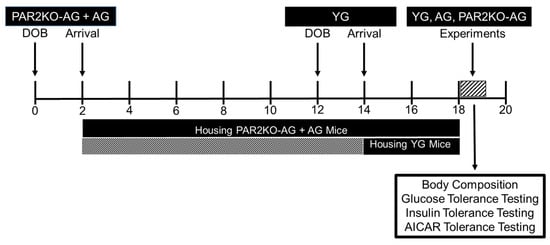 An LF50-BCA Minispec (Bruker Inc., Bilierica, MA, USA) assessed body composition in mice. The Minispec is a nuclear magnetic resonance (NMR) system that allows for the quantification of fat mass, lean mass, and free body fluid. NMR scans were completed by immobilizing fully conscious mice in a plastic tube that was placed in the instrument’s sample chamber for approximately 90 s. Body composition in mice assessed by NMR is highly correlated to the chemical analysis method of body composition assessment []. Further, epididymal adipose tissue (EAT) mass was assessed in YG mice (n = 8) and a subset of AG (n = 6) and PAR2KO-AG (n = 8) mice. Though we have previously documented that EAT and NMR are highly related []. The remaining AG and PAR2KO-AG mice were not euthanized and used for a separate study.
