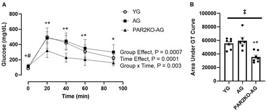 Glucose tolerance in YG (n = 7), AG (n = 6), and PARKO-AG (n = 7) male mice. Mice received an intraperitoneal injection of glucose (2 mg/kg body weight), and blood glucose was assessed at indicated time points following the injection (A). The glucose tolerance test area under the curve (AUC) was calculated from blood glucose values obtained at baseline and following glucose injection (B). Data were analyzed using a repeated measure (A) and one-way (B) ANOVA. * PAR2KO mice significantly different from AG mice, p ≤ 0.05, + PAR2KO mice significantly different from YG mice, p ≤ 0.05, # YG mice significantly different from AG mice, p ≤ 0.05, ‡ Significant 1 × 3 ANOVA, p ≤ 0.05.