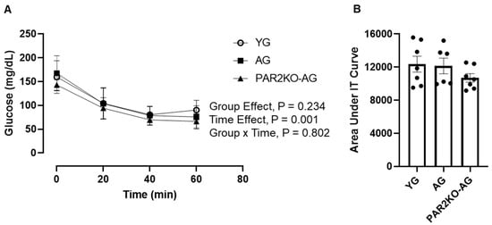 To determine if the differences in GT were due to changes in insulin sensitivity, we conducted IT test. The IT test involves an intraperitoneal injection of insulin at a dose that would be expected to suppress insulin secretion and allow for an evaluation of peripheral insulin sensitivity. As shown in Figure 3, no differences were observed in IT among YG, AG, and PAR2KO-AG mice. These findings indicate that the greater GT in PAR2KO-AG mice were likely not related to changes in insulin sensitivity but rather insulin secretion.