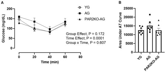 For glucose tolerance (GT) testing, mice were randomly selected from each group so that a total of 20 mice were studied (YG, n = 7; AG, n = 6; and PAR2KO-AG, n = 7). The randomly selected mice received an intraperitoneal injection of glucose (2.0 g/kg body weight) following an overnight fast (~15 h). Tail vein blood was collected (3–5 μL) at 0, 20, 40, 60, and 90 min following the injection and blood glucose was measured using a hand-held glucometer (Accu-Check, Roche Diabetes Care, Inc., Boston, MA, USA) in duplicate, and averaged. Mice were allowed to recover for 7–10 days following the GT testing before they were subjected to insulin tolerance testing.