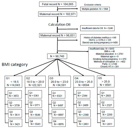 Figure 1 shows the participant selection process. After applying the exclusion criteria, 90,740 mothers were included in the present analysis: 2405 (2.7%) GDM cases, 705 (0.8%) Ed-GDM cases, and 1447 (1.8%) Ld-GDM cases. In 153 GDM cases, the gestational age at the time of GDM diagnosis was unknown. The mothers were further divided into five groups: G1: BMI <18.5 kg/m2 (n = 14,643), G2: BMI: 18.5 to <20.0 kg/m2 (n = 22,321), G3: BMI: 20.0 to <23.0 kg/m2 (n = 34,591), G4: BMI: 23.0 to <25.0 kg/m2 (n = 9594), and G5: BMI >25.0 kg/m2 (n = 9591). Participants in each group were further categorized into four groups based on the DII (Q1: the group with the most pro-inflammatory diet and Q4: the group with the highest anti-inflammatory diet) (Figure 1).