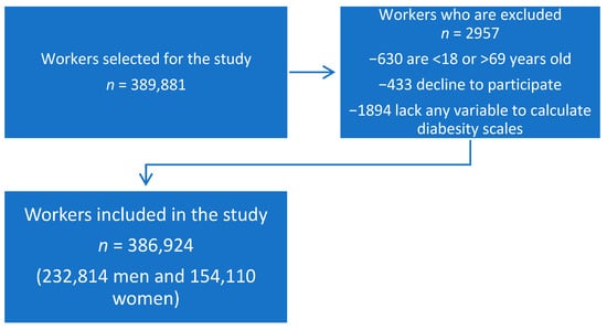 The study included 386,924 workers from different companies, notably: hospitality, construction, commerce, health, public administration, transportation, education, industry, and cleaning. The workers were from the autonomous communities of the Balearic Islands, Andalusia, the Canary Islands, the Valencian Community, Catalonia, Madrid, Castilla-La Mancha, Castile and León, and the Basque Country. The flowchart of the participants is presented in Figure 1.