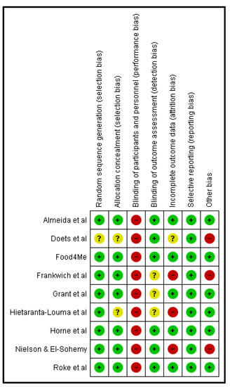 It is argued that personalized nutrition approaches could be more successful as they are tailored to an individual. It is also likely that compliance with such interventions is higher and facilitates long-term maintenance of positive behavioral changes [2,11]. Interestingly, one-third of the trials included in this study had an increased risk of attrition bias, bringing into question the improved compliance expected with the existing personalized nutrition approaches. Additionally, the longest duration documented in the studies included in this review was one year, with many studies ranging between three and four months. Statistically, significant improvements occur after the first six months of the nutritional intervention [41], but the effects of long-term nutritional studies are more modest. This is because maintaining long-term behaviors in the current food environment is challenging [41]. Thus, while most behavioral interventions of medium duration to improve diet and physical activity are reportedly successful, there is a paucity of evidence for longer-term efficacy, which would determine the significance of its impact [41,42].