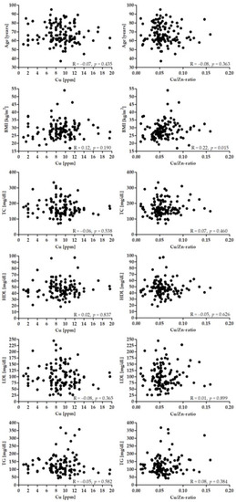 Figure 2 presents the correlation between the Cu and Cu/Zn-ratio and age, BMI, and lipid profile. There was a significant correlation between BMI and Cu/Zn-ratio (p < 0.05).