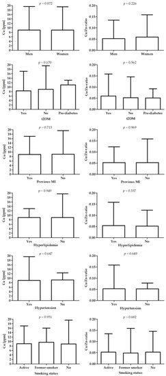 There are very limited data on the association of copper with other risk factors for CAD: hypertension, diabetes, hypercholesterolemia, and smoking, especially in the context of their concomitance with CAD. A study carried out on hair samples obtained from nearly 400 HTN patients revealed lower levels of Cu and Zn in the hair compared to a healthy control [56]. These results do not corroborate the data obtained by us and Vivoli et al., who found no difference between patients with or without hypertension [57]. Another risk factor for CAD, diabetes, was previously found to be not correlated with Cu values in hair compared to healthy individuals [58], which is consistent with our results. On the other hand, a Japanese study in more than 100 patients has shown that the Cu content in hair decreases with increasing glycated hemoglobin, which was suggested to be caused by diabetic nephropathy [59]. Previously, similar results were obtained in another article on patients diagnosed with diabetes mellitus, as well as descendants of both parents who were diagnosed with diabetes. This could suggest that the elemental imbalance occurs before the diagnosis of diabetes has been made [60], but the data on Cu tissue distribution in diabetic patients were previously pointed out as controversial [60,61]. Interestingly, a previously mentioned study in obese and diabetic women revealed that not only Cu/Zn-ratio was higher in obese patients, but it could also differentiate between diabetic and non-diabetic patients [48]. However, similarly to our study, a research on another group of obese diabetic patients found no correlation between Cu values and Cu/Zn-ratio in hair [28]. Furthermore, their data have not found a correlation between total cholesterol and triacylglycerol concentrations and Cu content or Cu/Zn-ratio in hair, neither in diabetic patients nor in healthy individuals. These results are consistent with a comparable study in hypertensive and obese patients with insulin resistance [62]. Smoking, another risk factor for CAD, had no influence on Cu and Zn in hair in patients with CAD [63,64]. In contrast, data from a similar study on patients with myocardial infarction (MI) revealed that they had lower Cu and Zn in hair compared to a healthy control [65]. The relation between Cu content and Cu/Zn-ratio in hair samples and risk factors for CAD remains unclear, as the results shown above often remain ambiguous.