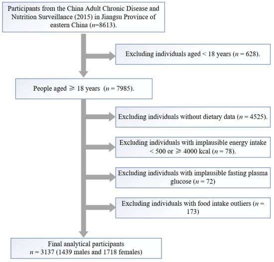 The China Adult Chronic Disease and Nutrition Surveillance Project (2015) in Jiangsu province covered thirteen surveillance sites, including Qinhuai, Chongan, Yunlong, Wujin, Wuzhong, Zhangjiagang, Rugao, Donghai, Jinhu, Xiangshui, Hanjiang, Jingkou and Jiangyan. Recruitment of participants using multistage stratified cluster random sampling methods: ① at each surveillance site, three streets/towns were randomly selected by using a cluster sampling method proportional to the population size; ② two further villages/communities were randomly selected in each street/township using a cluster sampling method; ③ in each village/neighbourhood, one village group was selected by using a simple random sampling method (at least 60 households); ④ 45 households were randomly selected, and all residents in the households were enrolled in the survey. After screening, as shown in Figure 1, a total of 3137 participants (54.8% female, n = 1718) aged ≥18 years old with complete 3-day and 24 h-dietary recall data were included in this study.