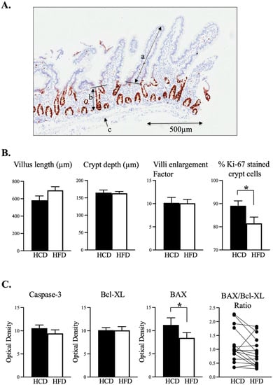 - Clara, R.; Schumacher, M.; Ramachandran, D.; Fedele, S.; Krieger, J.-P.; Langhans, W.; Mansouri, A. Metabolic Adaptation of the Small Intestine to Short- and Medium-Term High-Fat Diet Exposure. J. Cell Physiol. 2017, 232, 167–175. [Google Scholar] [CrossRef] [PubMed]