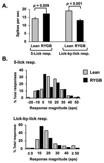 Electrophysiological recordings from the NTS in RYGB rats showed the same heterogeneity of firing patterns as have been recorded [,]. That is, in addition to taste-responsive cells, there were lick cells, lick-bout cells, anti-lick cells, and non-responsive cells. The firing rate in lick cells rhythmically followed the lick pattern with peak firing bursts at different times in the lick cycle depending on the cell []. Anti-lick cells were active until the lick bout began and then became relatively quiescent while the rat was licking, whereas lick bout cells showed the opposite pattern, i.e., they increased their firing rate when the rat began to lick but decreased their firing rate when the rat stopped licking. The relative frequencies of these styles of activity were not statistically different between RYGB and Lean rats, as shown in Figure 3B (chi-squared = 3.230, df = 4, p = 0.5201; RYGB N = 391 cells; Lean n = 438 cells). Figures showing examples of these cell types can be found in [].
