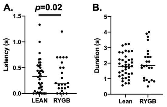 (A) Median latency for Lean = 0.327; RYGB = 0.188; Mann–Whitney U test p = 0.020 (B) Median duration for Lean = 1.800 s; RYGB = 1.842 s. Only 5L responses were included.