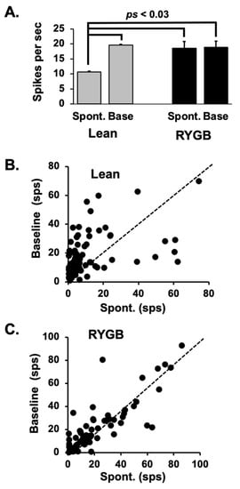 Changes in licking-related neural activity and in licking behavior were generally similar in RYGB and DIO rats, but different from that in Lean rats. For example, when Lean rats initiate a lick bout, the average firing rate of taste-responsive NTS cells increases, but this was not the case for cells in both RYGB and DIO [] rats. That is, in the NTS of RYGB and DIO rats, spontaneous and baseline firing rates were not different, though the spontaneous firing rate of NTS taste cells in RYGB rats was higher than that in Lean rats, unlike the spontaneous firing rate in DIO rats [].