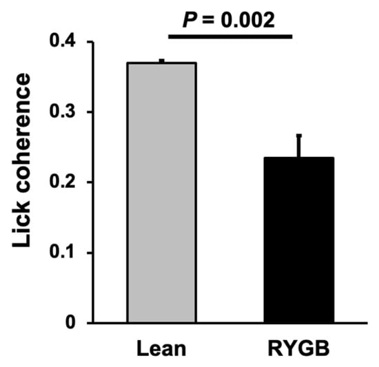 Taste-responsive cells in the NTS of RYGB rats were less-tightly coupled to the lick pattern than were taste-responsive cells in the NTS of Lean rats. This was evidenced by significantly less lick coherence in NTS taste cells in RYGB rats compared with those from Lean rats (Figure 7; Lean n = 67; RYGB n = 41 taste cells; t (106) = 3.12, p = 0.002).