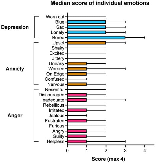 Median and IQR scores of individual emotions from the EES, grouped by subscale for all participants (n = 387). Subscales are depression (blue), anxiety (orange), anger (pink).