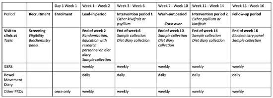 Eligible participants met with the unblinded researcher after the lead-in period to discuss the treatments. Participants were instructed to consume one and a half level teaspoons of psyllium a day, dissolved in liquid, or two peeled kiwifruit daily, unblended, and unheated, depending on intervention order, for four successive weeks. Participants were instructed to complete a three-day Food and Symptoms Times Diary []. The completed diet diaries were collected after each intervention period and at the end of the washout period (Figure 1). A rescue laxative (bisacodyl suppositories) was available upon request the week before a sample collection appointment; otherwise, participants could take laxatives.