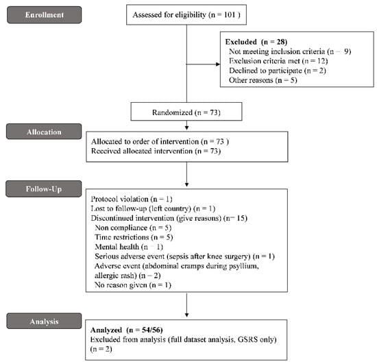 The previously developed “Christchurch IBS cohort to investigate mechanisms for gut relief and improved transit” (COMFORT), an observational study using Patient-Reported Outcomes (PRO) related to symptoms, dietary records, and a multi-omics approach to assess biological markers [], was adapted into a clinical trial. The COMFORT methodology entails information by PRO such as digestive health and mood, and multi-omics analyses (metabolome and microbiome) of biological samples (breath, blood, urine, and feces), and dietary data. The stated primary outcome was to determine whether the comprehensive assessments undertaken in the COMFORT cohort could be translated into a clinical trial. However, during recruitment, the design was found to be acceptable to participants, so recruitment was expanded to provide more definitive outcome data on efficacy and safety. Independently, the main clinical outcome was an improvement of the Gastrointestinal Symptom Rating Scale (GSRS) constipation domain score with both interventions []. Other secondary outcomes were increased weekly Complete Spontaneous Bowel Movements (CSBM) by one unit.