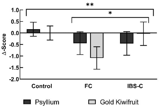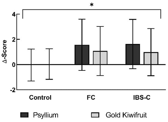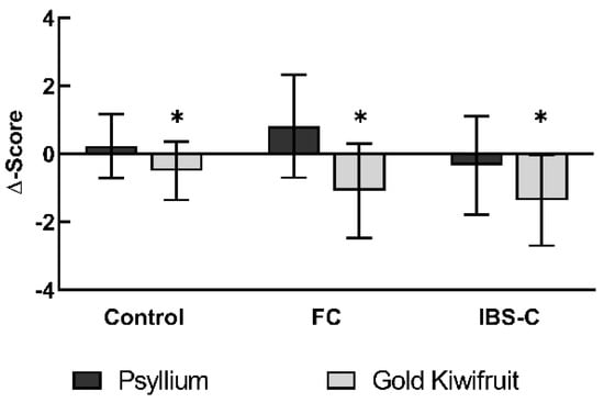 Changes in weekly straining scores. Δ-score: median score after subtraction of pre-intervention score from post-intervention = relative shift from baseline. Bars: arithmetic means, error bars: 95% confidence intervals. Positive score = increase in symptom, negative score = decrease in symptom. n = 56. Asterisks indicate statistical significance. * = Statistical significance between gold kiwifruit and psyllium, p = 0.021. FC, Functional Constipation: IBS-C, Constipation-predominant Irritable Bowel Syndrome.