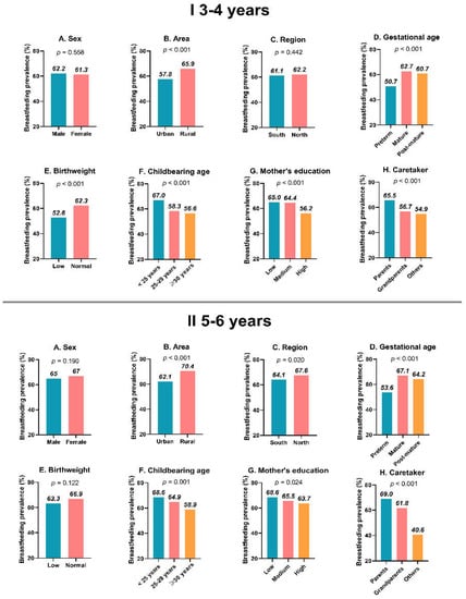 Univariate analysis (Chi-square test) showed that the differences of breastfeeding prevalence in the area, gestational age, childbearing age, mother’s education, and caretaker had statistical significances in both the 3–4 year and 5–6 year age group (all p < 0.05) and indicated that the following participants had a higher breastfeeding prevalence: thos in rural areas (65.9–70.4%), mature (62.1–67.1%), childbearing age <25 years (67.0–68.6%), low mother’s qualification (65.0–68.6%), and parents as caretakers (65.5–69.0%) (Figure 1). In general, the breastfeeding prevalence of the 5–6-year-old group was higher than that of the 3–4-year-old group.