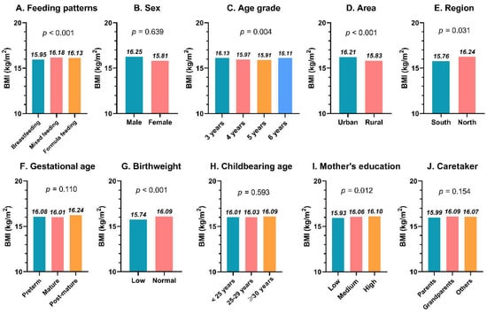 The mean distribution of BMI in subgroups of covariates showed differences. Univariate analysis (one-way ANOVA) showed that the differences in BMI means were statistically significant in terms of the feeding patterns, age grade, area, region, birthweight, and mother’s education (all p < 0.05) and indicated that participants with mixed feeding (16.18%), age six years (16.11%), in urban areas (16.21%), in the north (16.24%), with normal birthweight (16.09%), and a high mother’s qualification (16.10%) had higher BMIs (Figure 2).