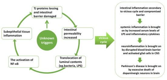 The “gut-brain axis” theory, which suggests that intestinal flora or other variables in the gut are intimately related to PD progression, has attracted a lot of attention recently []. A 2003 paper by Braak and his colleagues reported the appearance of intestinal Lewy bodies before the formation of Lewy bodies in SNpc, supporting the theory that PD may have its root in the enteric nervous system []. A dysfunctional intestinal barrier is one of many elements that can have an impact on brain function. As the initial line of protection for the body, the intact gut barrier is indispensable for maintaining homeostasis by shielding host tissues from environmental toxins and pathogens. If this defense is ruined, a sequence of pathological processes will be initiated. It is widely accepted that inflammatory bowel diseases (IBDs) and compromised intestinal barriers are related [,,]. A large number of predisposing genes such as LRRK2, GALC, GPR65, and FCGR2A are shared between IBDs and PD []. PD is more common in people with IBD than in the general population, pointing to the potential connection between PD and compromised intestinal barrier. Furthermore, several investigations have shown that PD patients have a deficiency in the intestinal barrier. Occludin and claudin are crucial tight junction (TJ) proteins that help build the epithelial barrier and were shown to be expressed less in the gut of PD patients []. Sven and his colleagues found that the blood and feces of PD patients had increased concentrations of zonulin, another type of significant TJ protein []. Moreover, the damaged intestinal barrier was also discovered in animal models for PD []. As a result, the dysfunction of the intestinal barrier caused by several factors is prone to trigger pathological progress such as the translocation of bacteria, the imbalance of gut flora, and finally cause microinflammation in interepithelial, subepithelial, and distant areas []. In our hypothesis, the vicious cycle resulting from the pathogenic process described above may trigger or exacerbate the development of PD, caused by leaky gut, the translocation of luminal antigens and toxicants are capable of initiating local as well as systemic inflammation, and the permeability of the blood-brain barrier will also be increased secondarily to increased pro-inflammatory cytokines in the blood afterward. Enteric lesions may affect the brain through the pathological pathway described above. We have drawn a picture to illustrate our hypothesis (Figure 1).