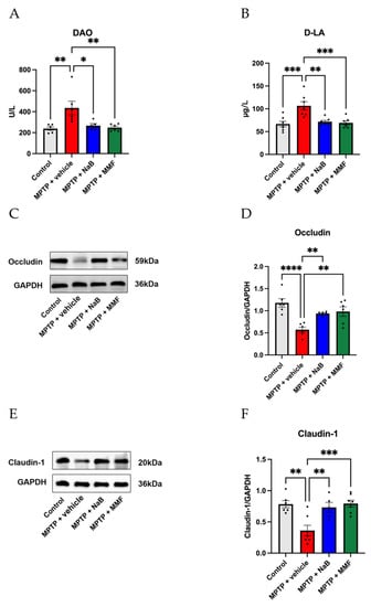 The intestinal barrier is a wall that blocks harmful substances including bacteria and their metabolites. The tight junction (TJ) is a crucial part of the intestinal barrier. As markers of the integrity of the intestinal barrier, TJ proteins such as occludin and claudin-1 were examined using Western blot analysis. The results illustrated that MPTP-treated animals expressed less occludin (p < 0.0001 vs. control) (Figure 6D) and claudin-1 (p < 0.01 vs. control) (Figure 6F) than PBS-treated mice. The treatment of NaB and MMF can effectively alleviate the TJ protein loss including occludin (p < 0.01 and p < 0.01 vs. MPTP + vehicle, respectively) (Figure 6D) and claudin-1 (p < 0.01 and p < 0.001 vs. MPTP + vehicle, respectively) (Figure 6F). DAO and D-LA were measured as indicators of intestinal integrity. According to the results, as shown in Figure 6, the serum levels of DAO (p < 0.01 vs. control) (Figure 6A) and D-LA (p < 0.001 vs. control) (Figure 6B) in the MPTP + vehicle group substantially increased when compared to the control group. Compared to the MPTP + vehicle group, the MPTP + NaB group, and the MPTP + MMF group show a remarkably protective impact on the intestinal barrier with decreased levels of DAO (p < 0.05 and p < 0.01 vs. MPTP + vehicle, respectively) (Figure 6A) and D-LA (p < 0.01 and p < 0.001 vs. MPTP + vehicle, respectively) (Figure 6B). These results suggest that NaB and MMF gavage can improve intestinal barrier damage in PD mice.