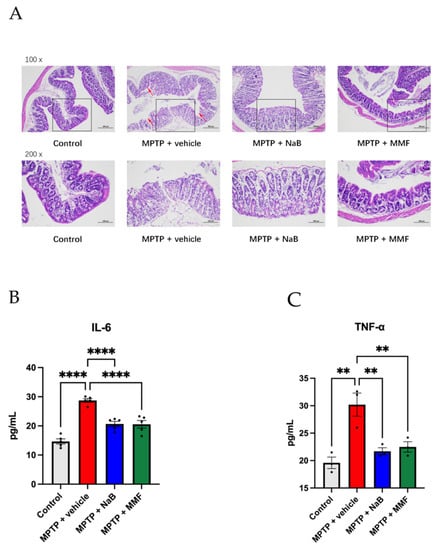 TNF-α and IL-6 are pro-inflammatory factors in the PD process. Mice treated with MPTP had significantly greater serum levels of TNF-α (p < 0.01 vs. control) and IL-6 (p < 0.001 vs. control) than mice in the control group. When compared to the MPTP + vehicle group, the NaB and MMF treatment substantially decreased the serum levels of IL-6 (p < 0.0001 and p < 0.0001 vs. MPTP + vehicle, respectively) (Figure 7B) and TNF-α (p < 0.01 and p < 0.01 vs. MPTP + vehicle, respectively) (Figure 7C) in MPTP-treated mice, indicating their effects to alleviate systemic inflammation in PD mice.