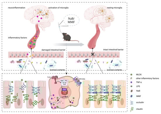 Herein, PD model mice were produced through the use of MPTP, and then, the experimental group was treated with NaB for demonstration of its PD-benefit impact and exploration of its exact mechanism. Additionally, in an attempt to investigate the independent positive effect of the GPR109A receptor’s activation, we added a treatment group that used MMF to replace NaB. Our results showed that in MPTP-modeled mice, gavage of NaB or MMF can rescue compromised motor performance and degenerated dopaminergic neurons. The integrity and permeability of the intestinal barrier as well as inflammatory cytokines in blood and glial cells’ activation were also assessed. The intestinal barrier is destructed, and systemic inflammation is exacerbated in PD mice; however, NaB or MMF therapy will ameliorate these effects. It has been suggested that NaB has anti-PD properties. Our findings in this study indicated that gavage of NaB could alleviate motor symptoms and neural pathology with activation of the GPR109A receptor, inhibition of the NF-κB signal pathway, and intestinal barrier repair, suggesting that NaB’s principal mechanisms involve activating GPR109A and then repairing the intestinal barrier. Another intriguing finding is that in PD animals, MMF could also have neuroprotective effects and repairs the damaged intestinal barrier by activating GPR109A, independent of NaB. This confirms the significant role of GPR109A in PD and sheds insight on this receptor that has not drawn widespread attention yet. As shown in Figure 9, we drew a picture to illustrate the mechanisms.