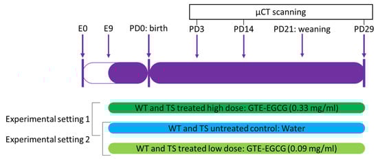 To test the genotype and GTE-EGCG treatment effects over development, the same mice were scanned at three different developmental stages: postnatal days (PD) 3, 14, and 29. We assessed the effects of continued pre- and postnatal GTE-EGCG treatment in skeletal development in two experimental settings, using the same high and low doses as in our previous study [] (Figure 1). As EGCG crosses the placental barrier and reaches the embryo [], GTE-EGCG treatment started prenatally at embryonic day 9 (E9) via the drinking water of the pregnant dams. After weaning, from postnatal day (PD) 21 to PD29, GTE-EGCG dissolved in water was made available to the young mice ad libitum for the entire duration of the experiment (Figure 1).