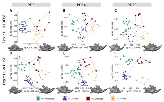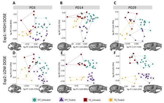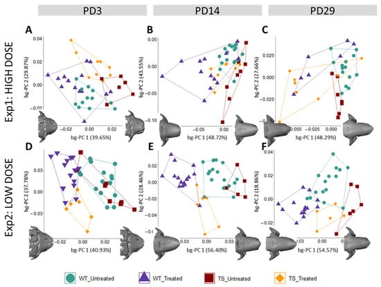 To extract shape information from the 3D coordinates, we performed generalized Procrustes analysis (GPA) separately for each craniofacial structure at each stage (PD3, PD14, and PD29) and for each experimental setting (high- and low-dose GTE-EGCG treatment). GPA scales, translates, and adopts a single orientation for all specimens, minimizing the influence of size []. To explore shape variation, we first performed principal component analysis (PCA), a data exploration technique that performs orthogonal data decomposition to reduce the high dimensionality of inter-related data and transforms the original variables into a new set of uncorrelated variables: the principal components (PCs). Then, we compared the results with those obtained from a between-group PCA (bg-PCA), an adaptation to regular PCA that maximizes separations between the groups. In this analysis, after GPA landmark superimposition, a PCA was run on the covariance matrix of the group averages (WT untreated, TS untreated, WT treated, and TS treated), and the resulting PC scores were the inputs for another PCA. The results from the PCA and bg-PCA methods were consistent, and as the main objective of this study was to identify shape differences induced by genotype and treatment, we reported the results from the bg-PCA, which represented the morphological features maximizing the differences between diagnostic groups [,,].