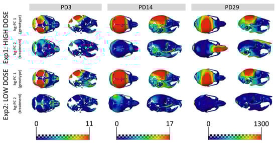 We expanded our analysis beyond the face to other structures of the skeletal system, such as the entire skull. The results showed that untreated WT and TS mice were clearly separated in the morphospace created by the first two bg-PCs at PD3 (Figure 3A,D), PD14 (Figure 3B,E), and PD29 (Figure 3C,F). The permutation tests confirmed that genotype differences in TS mice induced significant skull dysmorphologies over development, from PD3 (Pexp1 = 0.0042; Pexp2 < 0.0001), to PD14 (Pexp1;exp2 < 0.0001), and PD29 (Pexp1 = 0.0002; Pexp2 < 0.0001) (Supplementary Tables S11 and S12). The bg-PC1 axis separated mice by genotype, and the morphings representing the associated shape changes showed that TS untreated mice, falling on the negative extreme of the bg-PC1 axis, presented with shorter, wider, and more globular skulls, as compared with elongated and flat skulls typically associated with WT mice, which fell on the positive extreme of bg-PC1 (Figure 3). To visualize the specific differences, we represented the skull shape differences between the extremes of bg-PCs as heatmaps (Figure 4). The heatmaps associated with bg-PC1 indicated that the genotype differences between WT and TS mice were concentrated in the cranial vault (Figure 4, first and third row, red areas).