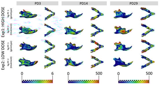 Mandibular morphological differences associated with genotype and treatment effects. Heatmaps showing the shape differences between the morphings on the positive and negative extreme of bg-PC1 (labeled as genotype) and the positive and negative extreme of bg-PC2 (labeled as treatment). Heatmaps are presented at PD3 (left), PD14 (middle), and PD29 (right) for experimental setting 1 (top) and experimental setting 2 (bottom). Red areas indicate anatomical regions with the largest shape differences. Heatmaps were derived using the shape associated with the positive extreme of bg-PC1 or bg-PC2 as the reference shape, and the shape associated with the negative extreme as the target shape.