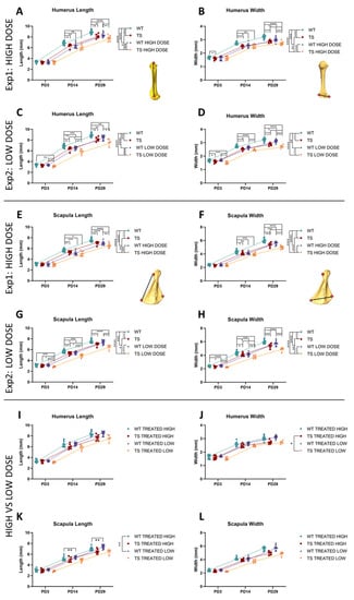We then compared the WT and TS mice treated with the high dose with the WT and TS mice treated with the low dose to evaluate the dose–response effects on the shape of the humerus and scapula (Figure 7I–L). We identified a dosing effect in the growth patterns of the humerus width in TS mice. The humeri of TS mice treated with the low dose were narrower than those treated with the high dose (p = 0.0264). Similarly, there was a dosing effect in the growth patterns of scapula length in WT mice (p = 0.0041), where the pairwise tests indicated that the WT mice treated with the low dose had a longer scapula at PD14 (p = 0.0064) and PD29 (p = 0.0044) than those treated with the high dose (Figure 7I–L).