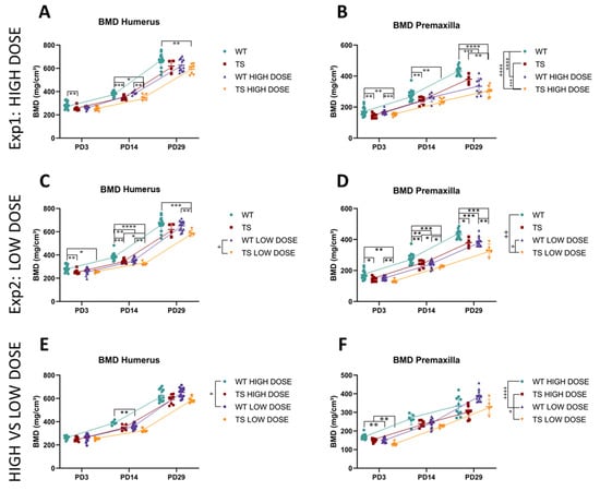 When evaluating the effects of the dosing on BMD, we found different developmental trajectories between WT mice treated with the high dose and WT mice treated with the low dose for the BMD of the humerus (p = 0.0352) and premaxilla (p < 0.0001), and between TS mice treated with the high dose and the low dose for the BMD of the premaxilla (p = 0.0167). Remarkably, we identified that WT mice treated with the low dose had a significantly lower BMD of the humerus than the WT mice treated with the high dose at PD14 (p = 0.0084) (Figure 8E). The same was observed in the BMD of the premaxilla at PD3, where WT and TS mice treated with the low dose presented a significantly lower BMD than those treated with the high dose (PWT = 0.0078; PTS = 0.0028) (Figure 8F). At PD29, this effect was reversed, because WT mice treated with the low dose presented higher BMD values than those treated with the high dose, even though it did not reach significance (Figure 8F).