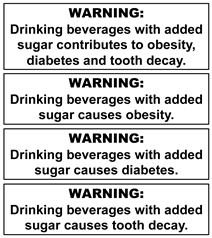 - Falbe, J.; Montuclard, A.; Engelman, A.; Adler, S.; Roesler, A. Developing sugar-sweetened beverage warning labels for young adults. Public Health Nutr. 2021, 24, 4765–4775. [Google Scholar] [CrossRef] [PubMed]