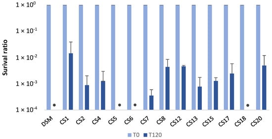 Bacterial survival of 14 P. distasonis strains to gastric stress after 120 min of incubation. The survival is shown as the ratio of the CFU/mL at T120 to the CFU/mL at T0. DSM: P. distasonis DSM 20701T; CS: clinical strains; • indicates the samples in which the CFU/mL reached the detection threshold (<10). All the data represent mean ± standard error from at least two independent experiments performed with each strain in triplicate (n = 2 × 3).