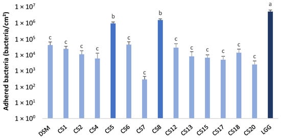 The results obtained for the adhesion of P. distasonis strains on Caco-2 cells revealed three groups that were significantly different (Figure 2). The first one was denoted as (a) with the positive control LGG, the second one was denoted as (b) with CS5 and CS8, and the third one (c) included 12 of the 14 P. distasonis strains. All the tested strains showed the capacity to adhere to biotic support after 3 h of incubation. The adhesion capacity of the 109 inoculated bacteria/mL ranged from 2.84 × 102 adherent bacteria/cm² (CS7) to 1.51 × 106 adherent bacteria/cm² (with CS8 showing an adhesion capacity relatively close to the one of the positive control LGG).