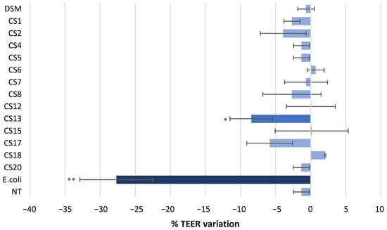 Effect of P. distasonis strains on Caco-2 monolayer TEER. E. coli ATCC 25922 was used as positive control. The results are shown as % of TEER variation after 24 h of incubation. DSM: P. distasonis DSM 20701T; CS: clinical strains. Statistical analysis was performed using an ANOVA test in comparison with % variation in nontreated (NT) Caco-2 (* p < 0.05, ** p < 0.01). All the data represent mean ± standard error from triplicate (n = 3).