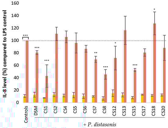 Effect of 14 strains of P. distasonis on IL-8 production by nonstimulated and LPS-stimulated (4 h; 1 ng/mL) HT-29 cells. The IL-8 levels were measured using ELISA. DSM: P. distasonis DSM 20701T; CS: clinical strains. Controls: untreated and E. coli LPS-stimulated HT-29; yellow: no LPS stimulation; red: HT-29 stimulated with E. coli LPS. Dotted line represents 100% equal to HT-29 responses to E. coli LPS stimulation. Statistical analyses were performed using an ANOVA test (* p < 0.05, ** p < 0.01, *** p < 0.001). The nontreated HT-29 control and all co-stimulation with E. coli LPS and P. distasonis assays were compared with the LPS-stimulated HT-29 control, which represents 100% of IL-8 released. The single stimulations of HT-29 with P. distasonis were compared with the nontreated HT-29 control. All the data represent mean ± standard error from triplicate (n = 3).