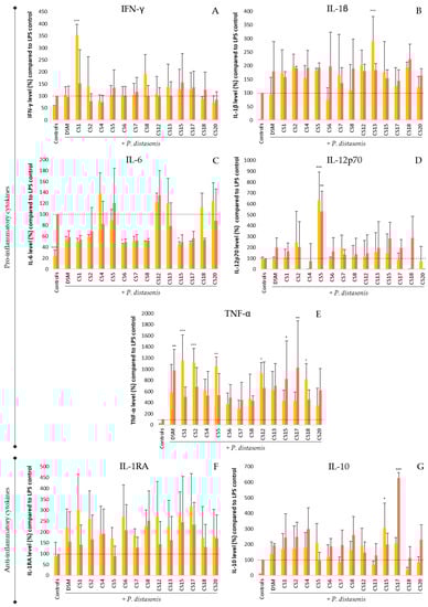 Immunomodulation properties of P. distasonis on nonstimulated and LPS-stimulated (18 h; 100 ng/mL) PBMCs. The cytokine levels were measured using Luminex technology. (A): IFN-γ; (B): IL-1β; (C): IL-6; (D): IL-12p70; (E): TNF-α; (F): IL-1RA; (G): IL-10. DSM: P. distasonis DSM 20701T; CS: clinical strains. Controls: nontreated and E. coli LPS-stimulated PBMC; yellow: no LPS stimulation; red: E. coli LPS stimulation. Dotted line represents 100% equal to PBMC responses to E. coli LPS stimulation. Statistical analyses were performed using ANOVA in comparison with the LPS-stimulated PBMC assay that represents 100% of cytokines released (* p < 0.05, ** p < 0.01, *** p < 0.001). All the data represent mean ± standard error from at least three samples (n ≥ 3).