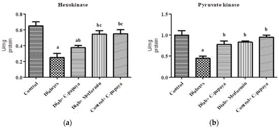 Outcome of ethanolic extract of C. papaya on (a) hexokinase and (b) pyruvate kinase levels in control and diabetic rats. Each bar illustrates the mean ± SEM of eight rats, with p < 0.05 demonstrating significant differences between the groups: a—control; b—diabetes; c—diabetic rats administered with ethanolic extract of C. papaya.
