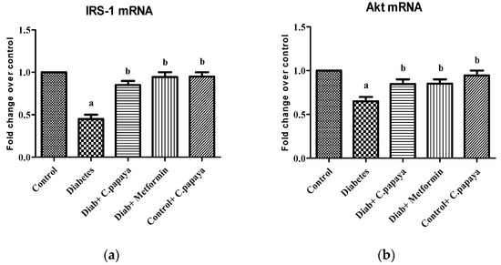 (a) IRS-1 mRNA expression levels in ethanolic extract of C. papaya in control and diabetic rats; (b) Akt mRNA expression levels in ethanolic extract of C. papaya in control and diabetic rats. Each bar demonstrates the mean ± SEM of eight rats, with p < 0.05 showing significant differences between the groups: a—control; b—diabetes.