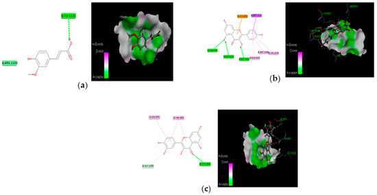 Molecular interaction of best three compounds with IRS-1; (a) trans-ferulic acid; (b) kaempferol; (c) quercetin.