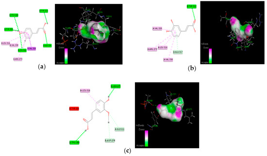 Molecular interaction of best three compounds with Akt; (a) p-coumaric acid; (b) caffeic acid; (c) trans-ferulic acid.