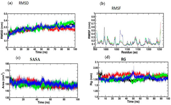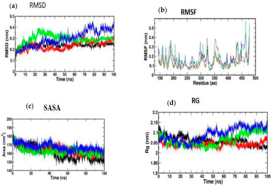Atomic RMSDs of the C atoms in an IRS-1–ligand complex, including kaempferol (red) and quercetin (green), as well as trans-ferulic acid (blue), were plotted in a time-based pattern, in addition to apo form (black) of IRS-1 protein, in a time-dependent manner (Figure 8a). Figure 8a showcases the stable nature of the apo form of IRS-1 after IRS-1 complexes with all compounds. Compared to other complexes, kaempferol only showed mild RMSD at 85 ns, after which it attained a stable form. Figure 8b shows the RMSF graph of IRS-1 with selected compounds. This plot shows that all the compounds showed stable form except trans-ferulic acid. Trans-ferulic acid showed a huge variation at the 1075 residues position, after which it attained a stable conformation. The evaluation of RG value for apoproteins and compounds (Figure 8d) was completed in order to investigate the binding impact of ligand to protein on compactness. RG values in the lower range indicate a strong association between the ligand and the protein, but the RG value of a stably folded protein is consistent. This plot demonstrated that the protein displayed a slight change of about 48–50 ns, after which it reached a stable state. In protein folding studies, the SASA of a protein is investigated as a critical element in the stability of protein, and it is found to be important. In this study, we determined the SASA values for the apo form of IRS-1 and for the proteins associated with each of the compounds, and the results are presented in Figure 8c.