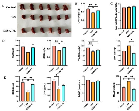 Liver injury has been recognized to be one of the main extraintestinal manifestations of colitis []. In our study, we found that the weight of the liver in the DSS group was significantly lower compared with the control group (Figure 1A,B, p < 0.05), and this decline was reversed by 2′-FL. The ratio of liver weight to body weight had no significant difference among the three groups (Figure 1C, p > 0.05). The levels of T-AOC and GSH in liver were remarkably increased, and MDA in the liver was significantly decreased after being treated with 2′-FL when compared with colitis mice (Figure 1D, p < 0.05). Correspondingly, compared with the DSS group, the concentration of SOD in serum was increased distinctly and MDA in serum was significantly decreased after 2′-FL treatment (Figure 1E, p < 0.05), suggesting systemic oxidative stress. All of the above data revealed that colitis induced the oxidative stress in the liver, and 2′-FL could effectively alleviate it.