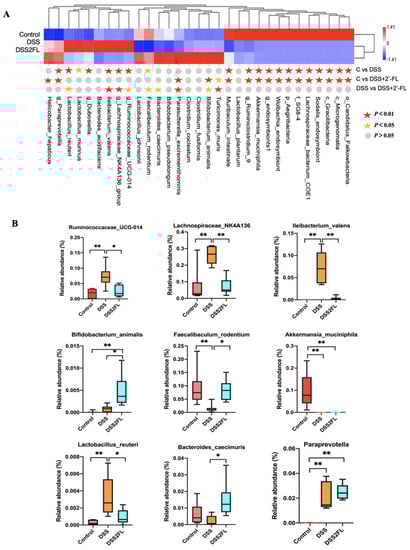 The full-length 16S rRNA sequencing of the fecal microbiota was then carried out to determine the unique alterations in the makeup of the gut microbiota following the addition of 2′-FL under conditions of liver injury. To identify the species that 2′-FL artificially altered, the relative abundance of microbes was compared across groups, and the p-value was determined using ANOVA. The results showed that, viewed collectively, the picture in the DSS + 2′-FL group was strikingly different from that in the DSS group, as well as that in the control group (Figure 2A), with 39 species/genera differentially enriched in the three groups (p < 0.05). Specifically, nine of them are further shown in Figure 2B. Lachnospiraceae_NK4A136, Iiebacterium_valenns, Lactobacillus_reuteri, and Paraprevotella spp. were relatively over-represented in individuals with cotilis (p < 0.05), while Bifidobacterium_animalis, Akkermansia_muciniphila, and Bacteroides_caecimuris were relatively enriched in the control and DSS + 2′-FL groups (p < 0.05).