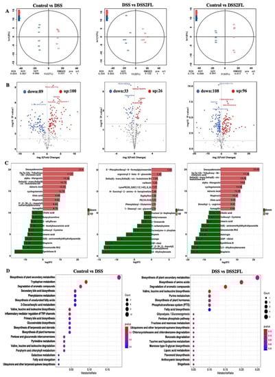 2′-FL-associated metabolic patterns in C57BL/6J mice. (A) The orthogonal projections to latent structures-discriminant analysis (OPLS-DA) among every two groups. (B) Volcano plot among every two groups with the criteria of fold-change (FC) threshold = 2 and p < 0.05. (C) The histogram of the enriched pathway of differential metabolites in B. (D) KEGG-enriched map of differential metabolites. In each panel, A, DSS group; C, DSS2FL group; and E, control group; n = 6 for each group.