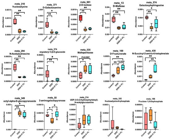 2′-FL, a main type of HMO, cannot be digested in the upper digestive tract because of the lack of glycosidehydrolase. When arriving at the colon, it will be fermented by gut microbiota, and may subsequently induce a series of changes in glycometabolism. Therefore, we further analyzed the metabolites associated with carbohydrate metabolism and 15 remarkably changed ones were screened out. As shown in Figure 4, among them, nine metabolites in the DSS group (fructose-lysine, D-galactosamine, β-D-lactose, D-maltose, galactosylsphingosine, N-acetyputrescine, ergosteryl 3-β-D-glucoside, 2-aminogalactopyranose, and fructoselysine-6-phosphate) declined significantly when compared with the control group (p < 0.05) and were slightly up-regulated after 2′-FL treatment. The remaining six metabolites were increased in the DSS group, i.e., maltopentaose (p < 0.05), D-fructuronate (p < 0.05), N-Succinyl-2-amino-6-ketopimelate (p > 0.05), octyl alpha-D-glucopyranoside (p < 0.05), UDP-3-O-(3-hydroxymyristoyl)-N-acetylglucosamine (p > 0.05), and fructose 1,6-bisphosphate (p > 0.05). 2′-FL treatment significantly enhanced the N-Succinyl-2-amino-6-ketopimelate (p < 0.05), D-fructuronate (p = 0.0659), and 2-aminogalactopyranose (p < 0.05) abundance.