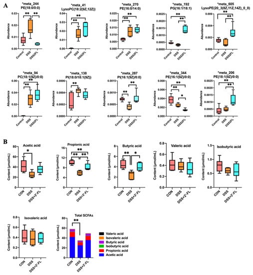 Gut microbiota can regulate the absorption, storage, and energy acquisition of the host, thus participating in lipid metabolism. Thus, we analyzed the lipid metabolism and found 12 significantly altered metabolites. Among them, the levels of phosphatidyl ethanolamine (PE, 18:0), PE (16:0/14:0), PE (14:0/16:0), lysophosphatidyl choline (LysoPC, 18:2), phosphatidyl choline (PC, 18:1), and phosphatidyl inositol (PI, 18:0/18:1) in the DSS group were significantly increased compared with the control (Figure 5, p < 0.05). After being treated with 2′-FL, PE (18:0) and PE (16:1) were remarkably declined, while the levels of PG (16:1/18:1), PI (16:1), LysoPE (20:3), and PE (18:1) were significantly up-regulated (Figure 5, p < 0.05). We also detected changes in SCFAs in feces using GC-MS. The results showed that DSS induced a sharp decline in acetic acid, propionic acid, and butyric acid, as well as in total SCFAs in colitis mice (p < 0.05), while they were up-regulated to different degrees in the DSS + 2′-FL group. There was no significant difference in the concentrations of isobutyric acid, valeric acid, and isovaleric acid among the three groups (p > 0.05).