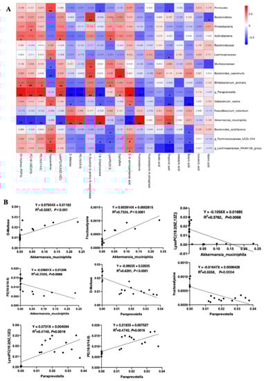 The correlation analysis between specific microbes and metabolites. (A) Correlation heatmap of microbes and metabolites in the colon (top 20). **, p < 0.01, *, p < 0.05. (B) The simple linear regression of representative microbes, mainly Akkermansia_muciniphila and Paraprevotella spp., and metabolites analyzed by Prism 9.0.