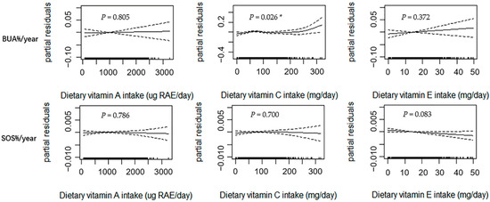 Relationships between dietary vitamin A, C, and E intakes and annual relative rates of changes in BUA and SOS estimated using the generalized additive model (GAM) among all subjects (n = 1418). Notes: Age, sex, weight, height, dietary energy intake, dietary vitamin D intake, dietary calcium intake, physical activity, pubertal stage, and baseline bone phenotype were adjusted in the model. The y-axis is the partial residuals of changes in bone parameters after removing the effects of the covariates. The x-axis is the estimated dietary vitamin A, C, and E intakes, and the rug plot along the bottom represents each observation. The solid line indicates the fitted curve between variables. The dashed lines represent the 95% confidence intervals. RAE, retinol activity equivalents; BUA%/year, annual relative rate of change in broadband ultrasound attenuation; SOS%/year, annual relative rate of change in speed of sound; * p < 0.050.
